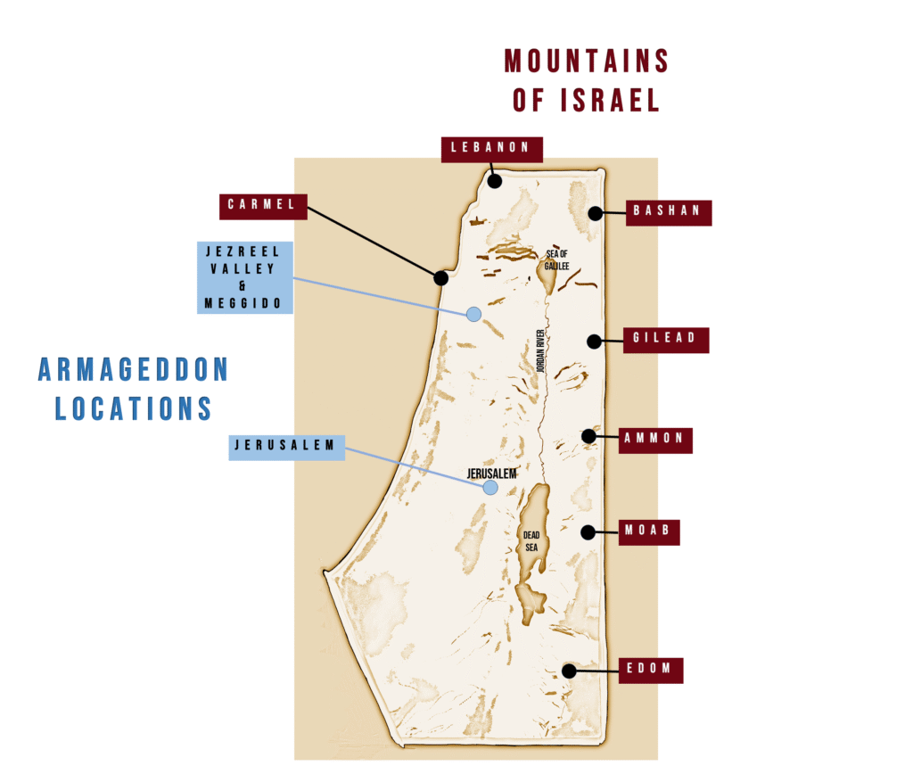 At Gog Magog, the focus is on the mountains of Israel which are east of the Sea of Galilee and the Dead Sea, far east from Megiddo and east of Jerusalem. Gog’s burial is described as blocking passengers coming from east of the Sea – this further indicates that Ezekiel is talking about the mountains east of the Dead Sea, far from Jerusalem and Megiddo.