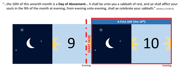 The number of a day (its date) is assigned to its daytime. It’s written that Yom Kippur for example is the 10th day of the month and it’s observed from the evening of the 9th to the evening of the 10th. Father says start your observation on the evening of the 9th. To us, this is Him telling us the one foolproof way of ensuring that you are in place to capture the full day of the 10th, as shown in the image below. That is – you start your observation a bit early the day before so that when the new day starts, you’re doing what HE said to do.