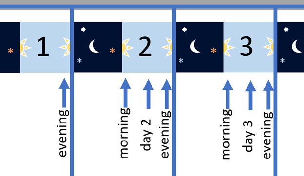 In our understanding of the Scriptures, there are four parts to a day: evening, nighttime, morning, and daytime. All together those four parts make up a day.